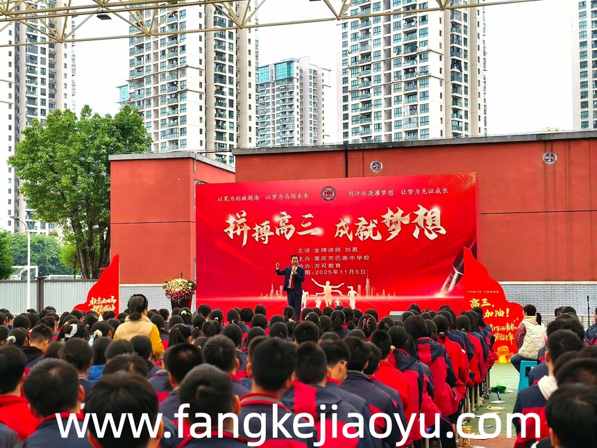 2025.11.05/重庆市巴南中学校方可教育大型励志演讲时间:2025-11-06 学校:重庆市巴南中学校 时间:11月5日,下午 主题:拼搏高三,成就梦想 主讲:金牌讲师刘勇 对象:高三年级全体师生