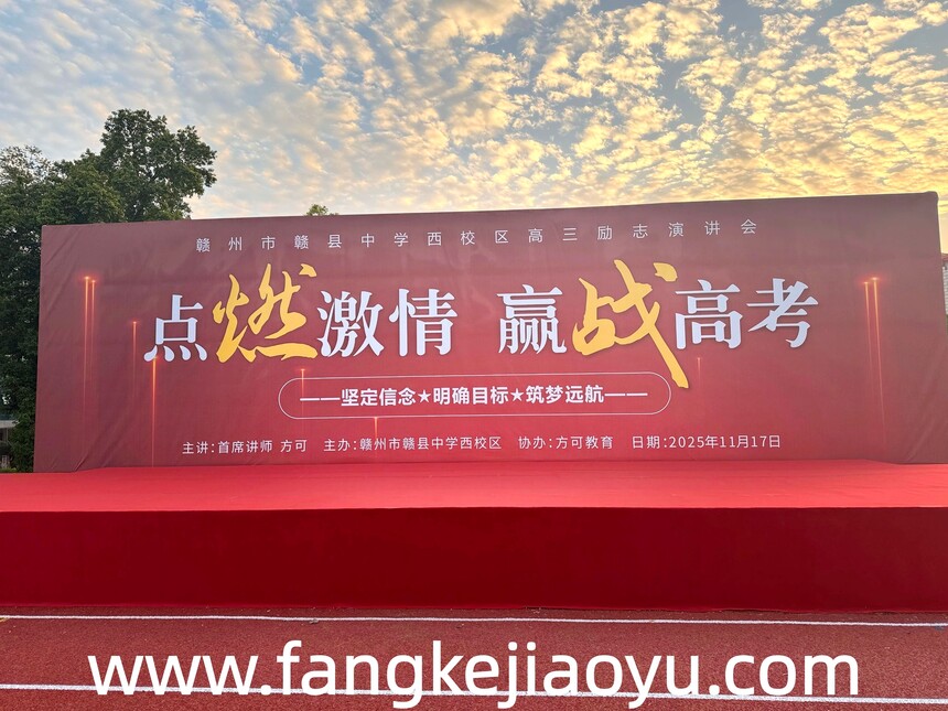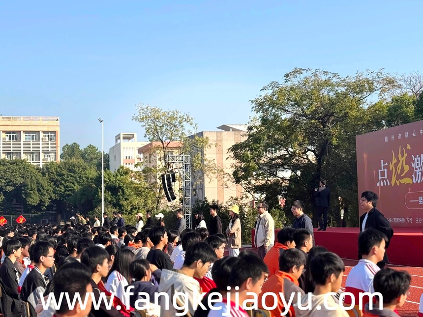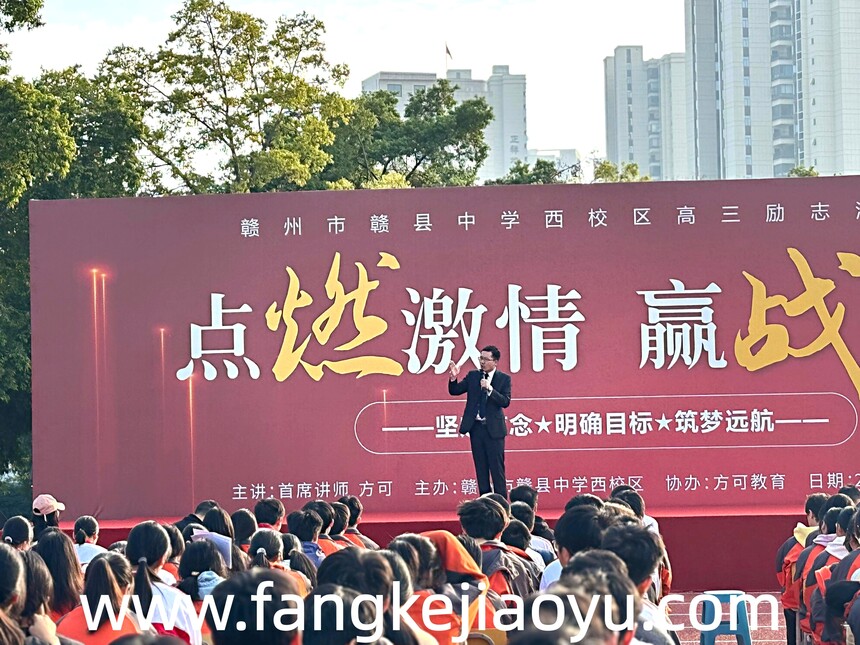 2025.11.17/江西省赣州市赣县中学西校区方可教育励志演讲时间:2025-11-22 学校:赣州市赣县中学西校区 时间:11月17日,上午 主题:点燃激情,赢战高考 主讲:首席讲师方可 对象:高三年级全体师生