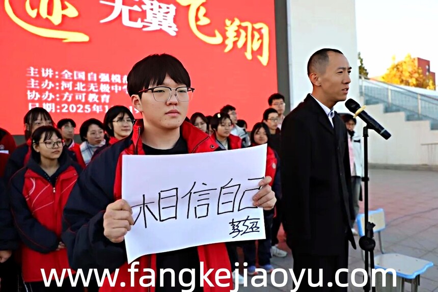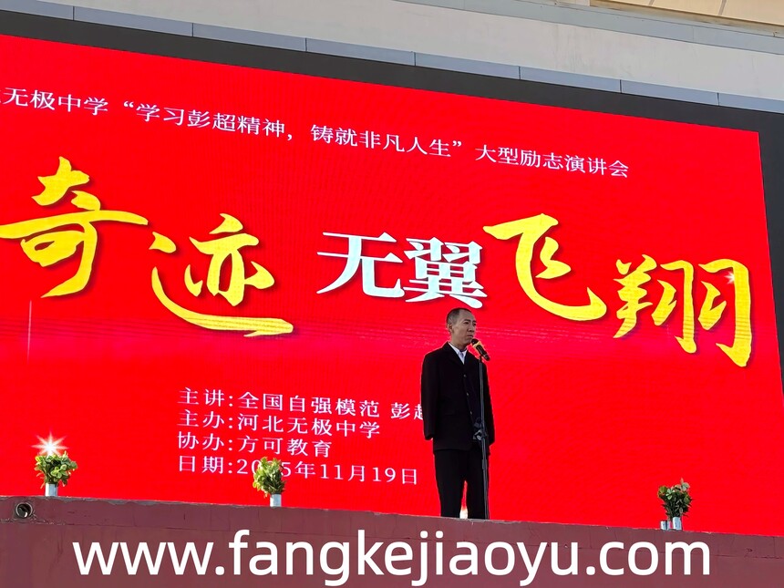 2025.11.19/河北省石家庄市无极中学方可教育大型励志演讲时间:2025-11-26 学校:河北无极中学 时间:11月19日,上午 主题:相信奇迹,无翼飞翔 主讲:方可教育金牌讲师彭超 对象:高三年级全体师生