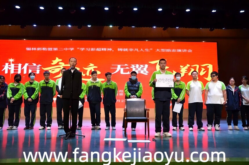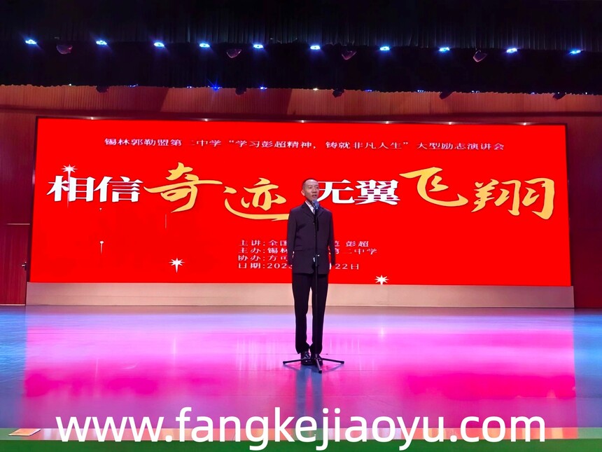 2025.11.22/内蒙古锡林郭勒盟第二中学方可教育励志演讲时间:2025-11-26 学校:锡林郭勒盟第二中学 时间:11月22日,下午 主题:相信奇迹,无翼飞翔 主讲:方可教育金牌讲师彭超 对象:高三年级全体师生