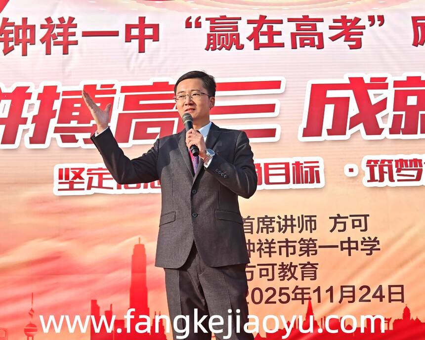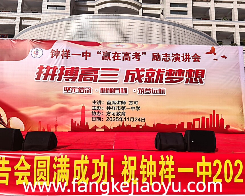 2025.11.24/湖北省钟祥市第一中学方可教育大型励志演讲时间:2025-11-27 学校:钟祥第一中学 时间:11月24日,下午 主题:拼搏高三,成就梦想 主讲:首席讲师方可 对象:高三年级全体师生