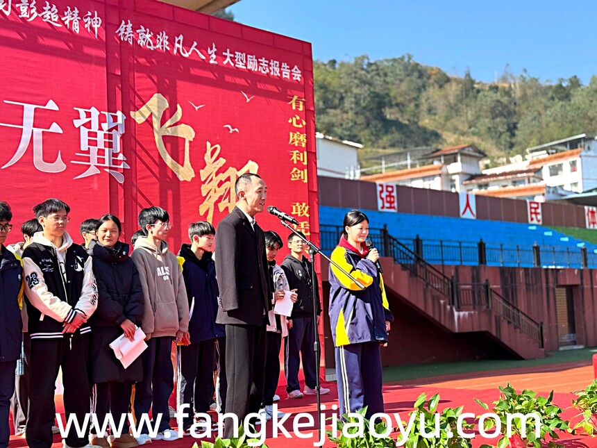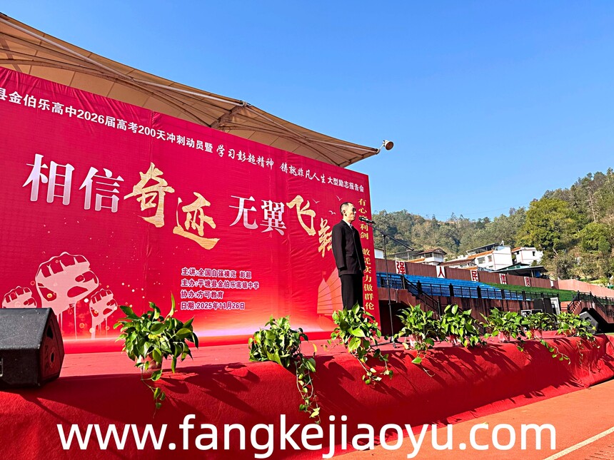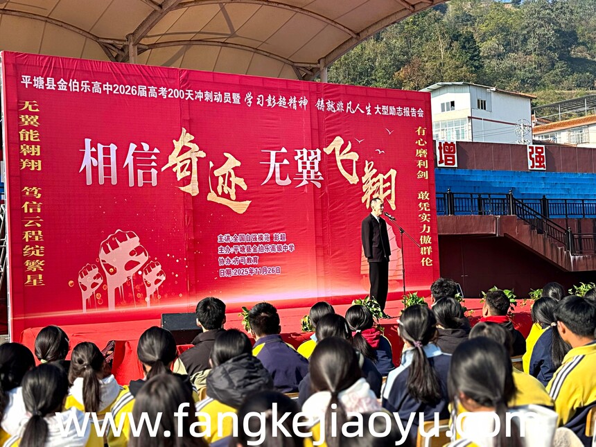2025.11.26/贵州省黔南州平塘县金伯乐高中方可教育励志演讲时间:2025-11-28 学校:平塘县金伯乐高级中学 时间:11月26日,上午 主题:相信奇迹,无翼飞翔 主讲:方可教育金牌讲师彭超 对象:全校师生