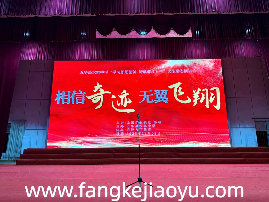 2025.12.08/广东省梅州市五华县水寨中学方可教育励志演讲时间:2025-12-09 学校:五华县水寨中学 时间:12月8日,晚上 主题:相信奇迹,无翼飞翔 主讲:方可教育金牌讲师彭超 对象:初三、高三全体师生