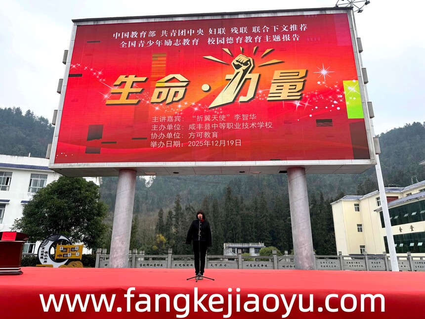 2025.11.19/湖北省恩施咸丰中等职业技术学校方可教育励志演讲时间:2025-12-22 学校:咸丰县中等职业技术学校 时间:12月19日,下午 主题:生命·力量 主讲:方可教育金牌讲师李智华 对象:全校师生