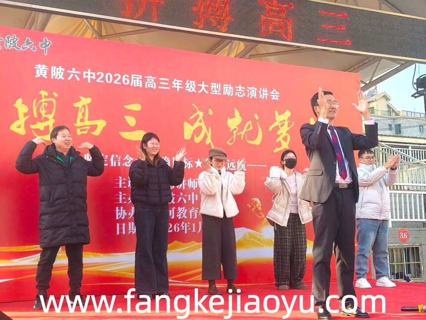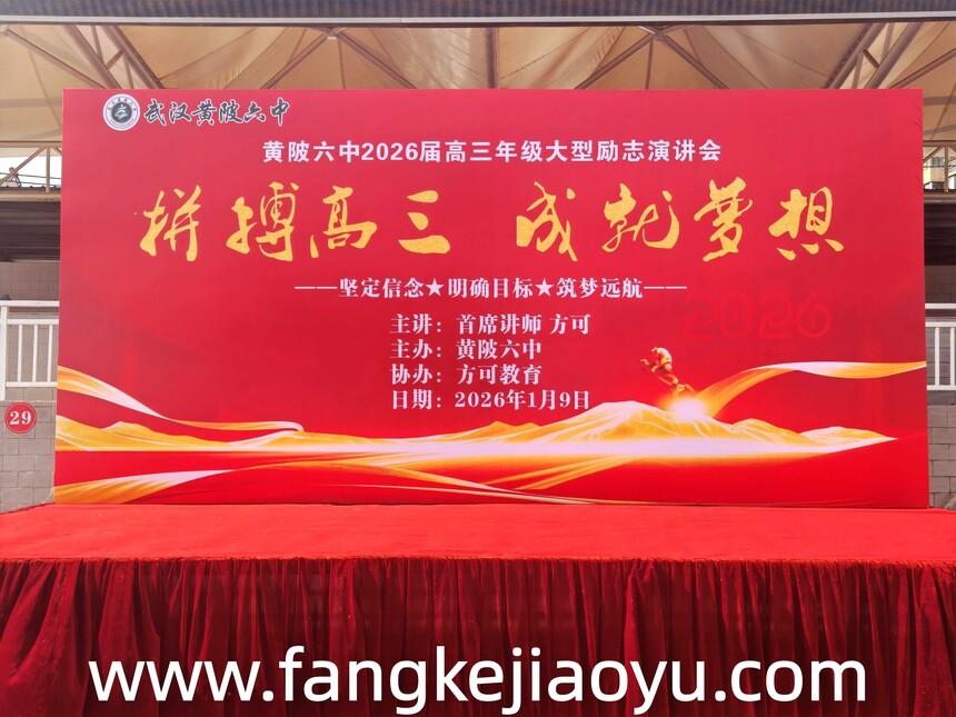 2026.01.09/湖北省武汉市黄陂区第六中学方可教育励志演讲时间:2026-01-10 学校:武汉市黄陂区第六中学 时间:1月9日,上午 主题:拼搏高三,成就梦想 主讲:首席讲师方可 对象:高三年级全体师生