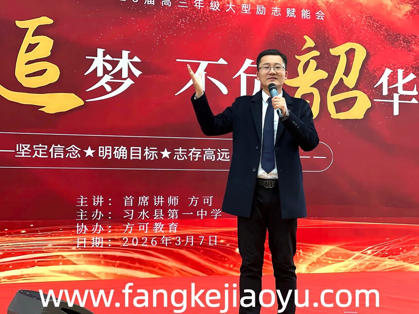 2026.03.07/贵州省遵义市习水县第一中学方可教育励志演讲时间:2026-03-16 学校:习水县第一中学 时间:3月7日,下午 主题:激情追梦,不负韶华 主讲:首席讲师方可 对象:高三年级全体师生