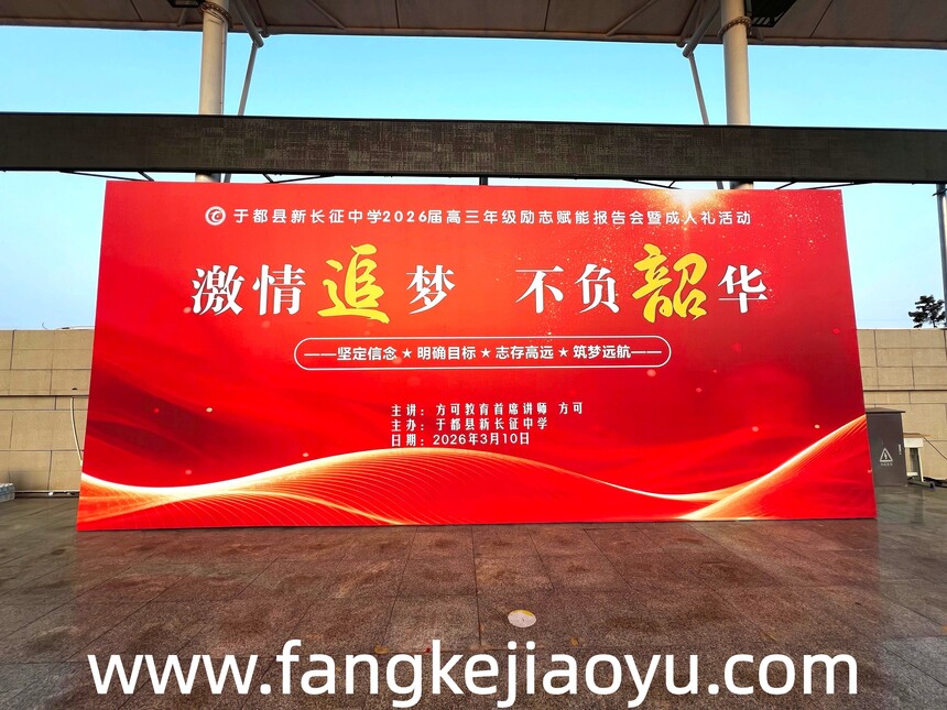 2026.03.10/江西省赣州市于都县新长征中学方可教育励志演讲时间:2026-03-16 学校:于都县新长征中学 时间:3月10日,上午 主题:激情追梦,不负韶华 主讲:首席讲师方可 对象:高三年级全体师生