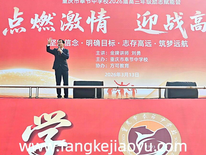 2026.03.13/重庆市奉节中学方可教育大型励志演讲时间:2026-03-18 学校:重庆市奉节中学校 时间:3月13日,上午 主题:点燃激情,迎战高考 主讲:金牌讲师刘勇 对象:高三年级全体师生